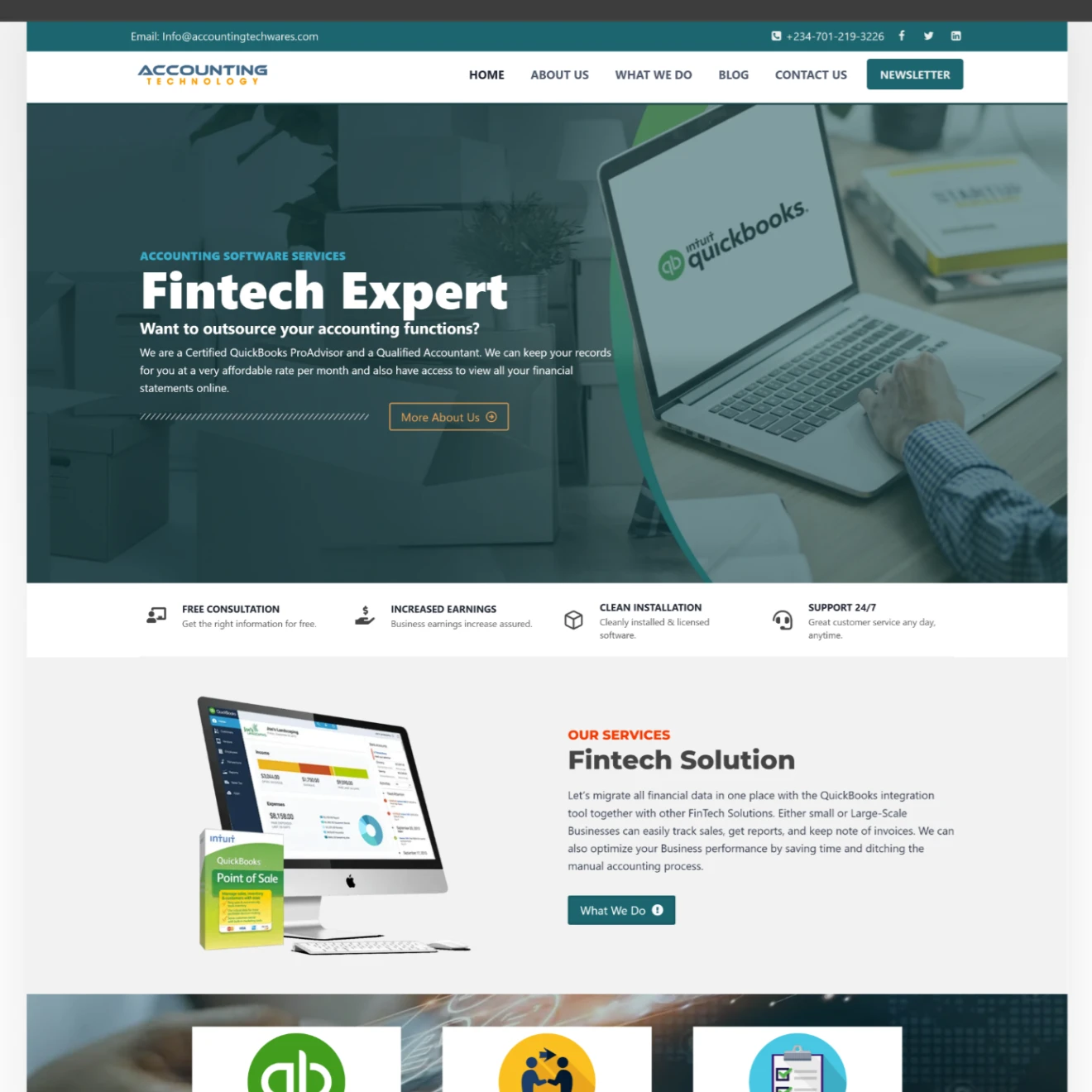 A professional website built for a certified Nigerian fintech company offering QuickBooks installation, tax, and accounting software services.