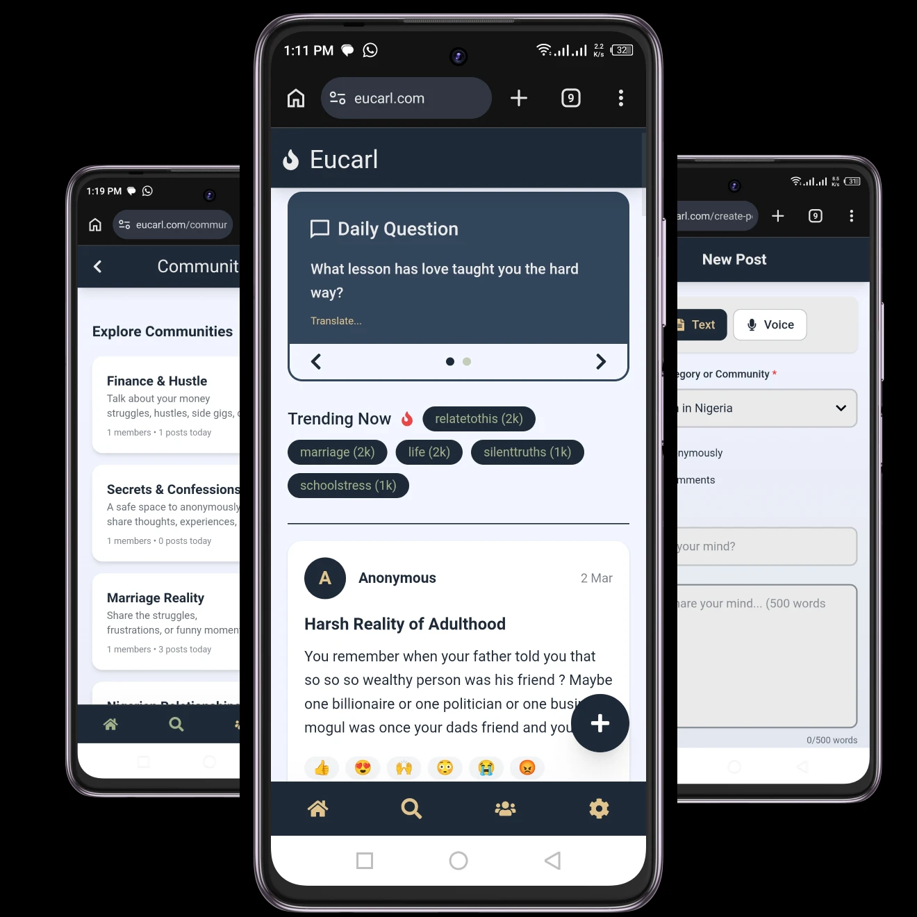 Eucarl gives people a safe space to share personal stories anonymously, with untraceable accounts and auto-generated usernames that protect every user’s identity.